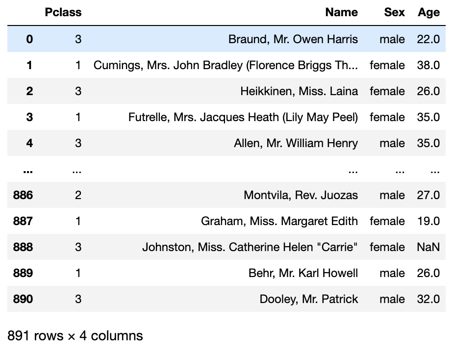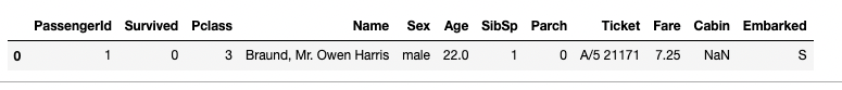titan_df.iloc[[0]] # iloc 위치가 0번째 행인 값들만 추출해줘