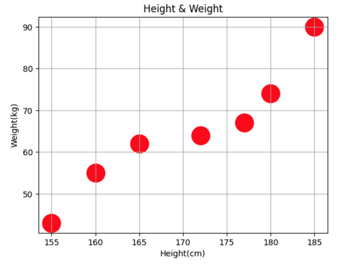 weight = [62,67,55,74,90,43,64] # 몸무게 데이터 # 165, 62가 1번째 Red -> 177, 67 Green 순서대로