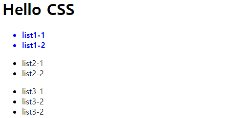 h1+ul{color: blue; font-weight: bold;} /* + 를 사용하여 h1 과 가장가까운 형제에게만 적용 */