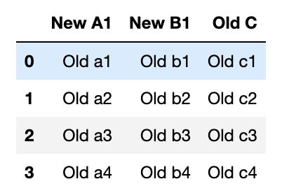 df = pd.DataFrame({'Old A' : ['Old a1', 'Old a2', 'Old a3', 'Old a4'], 'Old B' : ['Old b1', 'Old b2', 'Old b3', 'Old b4'], 'Old C' : ['Old c1', 'Old c2', 'Old c3', 'Old c4']})