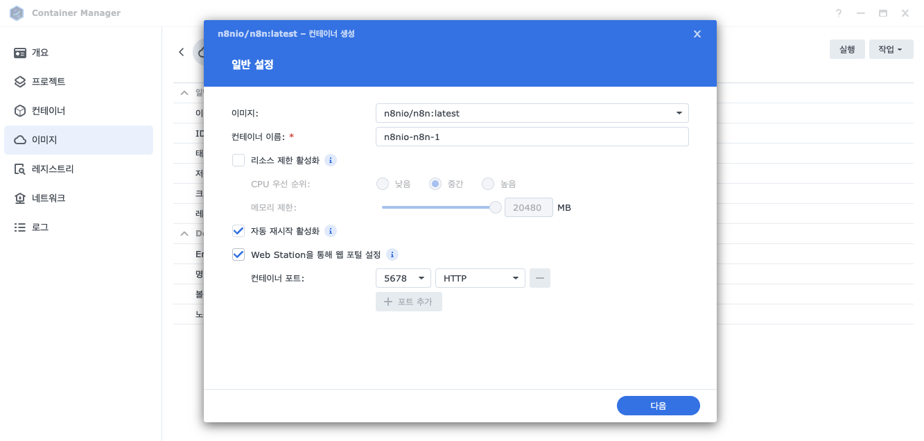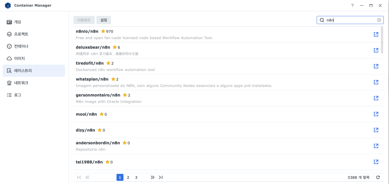 메인메뉴 > Container Manager > 레지스트리 > n8n 검색 > n8nio/n8n 다운로드